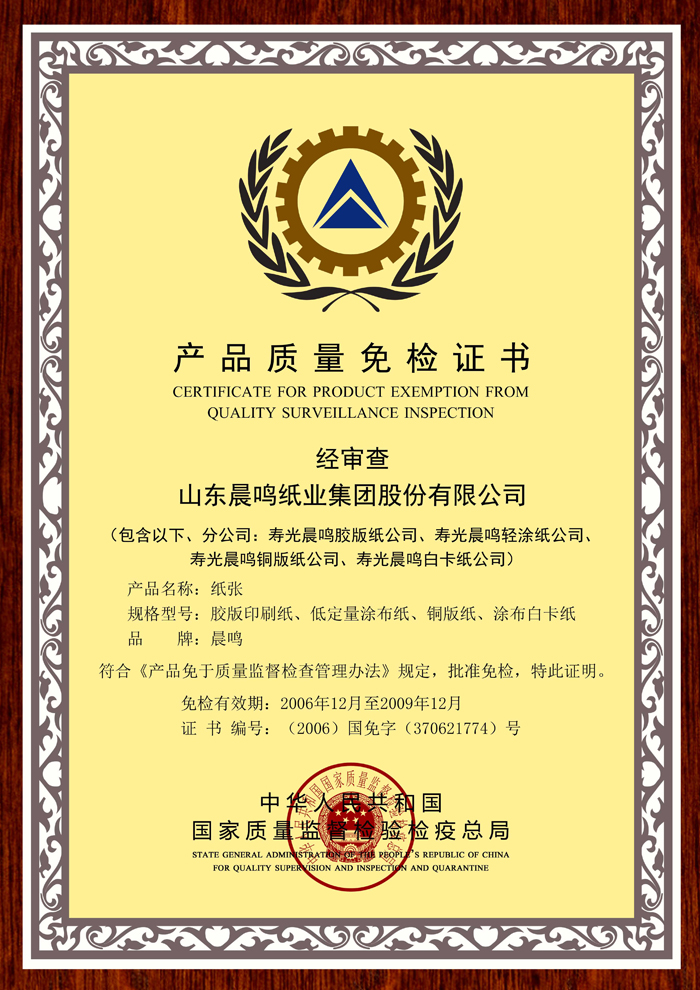 产品质量免检证书
