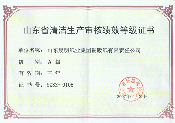 山东省清洁生产审核绩效等级证书