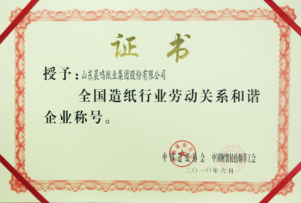 全国造纸行业劳动关系和谐企业称号