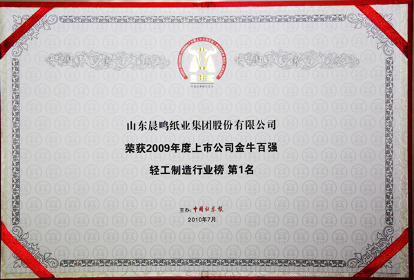荣获2009年度上市公司金牛百强轻工制造行业榜第一名