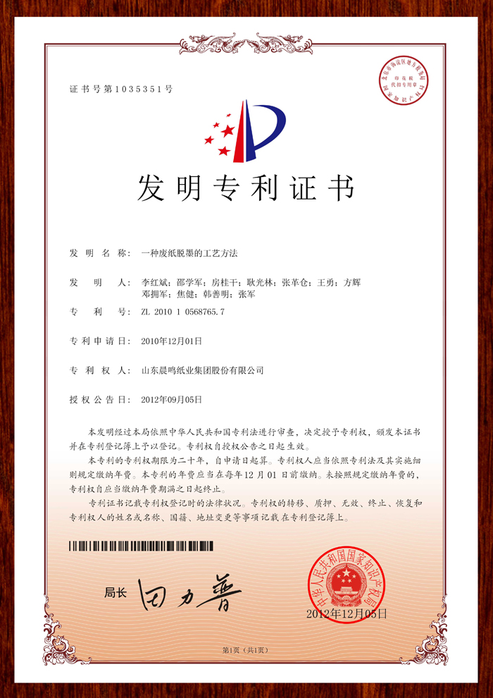【发明专利证书】一种废纸脱墨的工艺方法