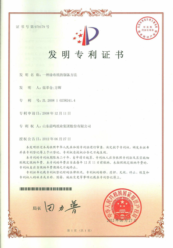 一种涂布纸的制备方法 发明专利证书