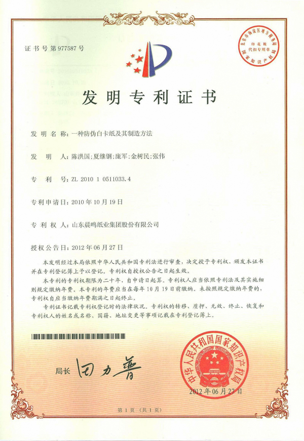 一种防伪白卡纸及其制造方法 发明专利证书