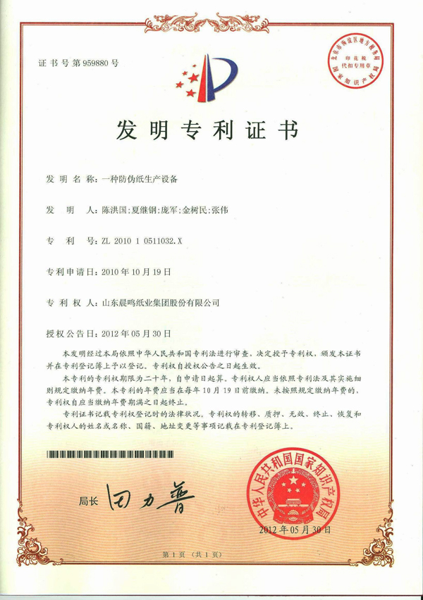 一种防伪纸生产设备 发明专利证书